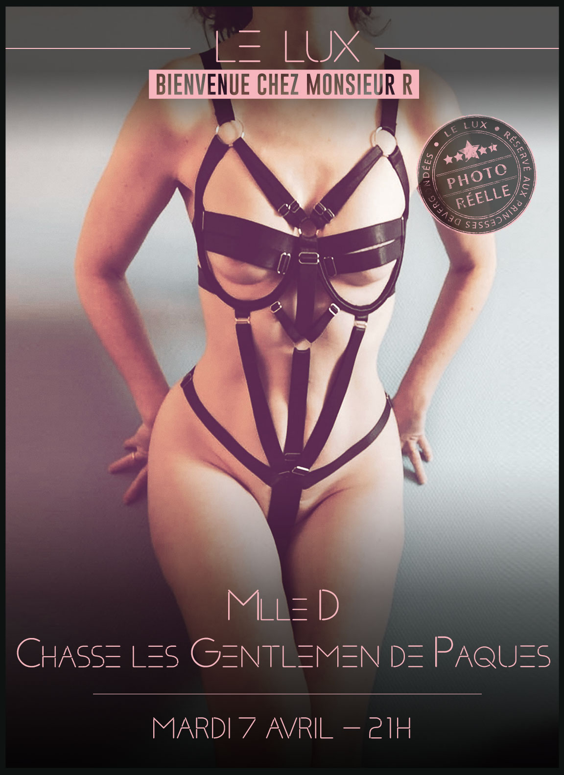 Mademoiselle D, à son arrivée, cherchera 5 ou 6 gentlemen l’attendant à différents endroits du LuX. Elle ira les découvrir sensuellement un par un : caresses, baisers profonds, puis elle les déshabillera lentement pour découvrir les objets de son désir.